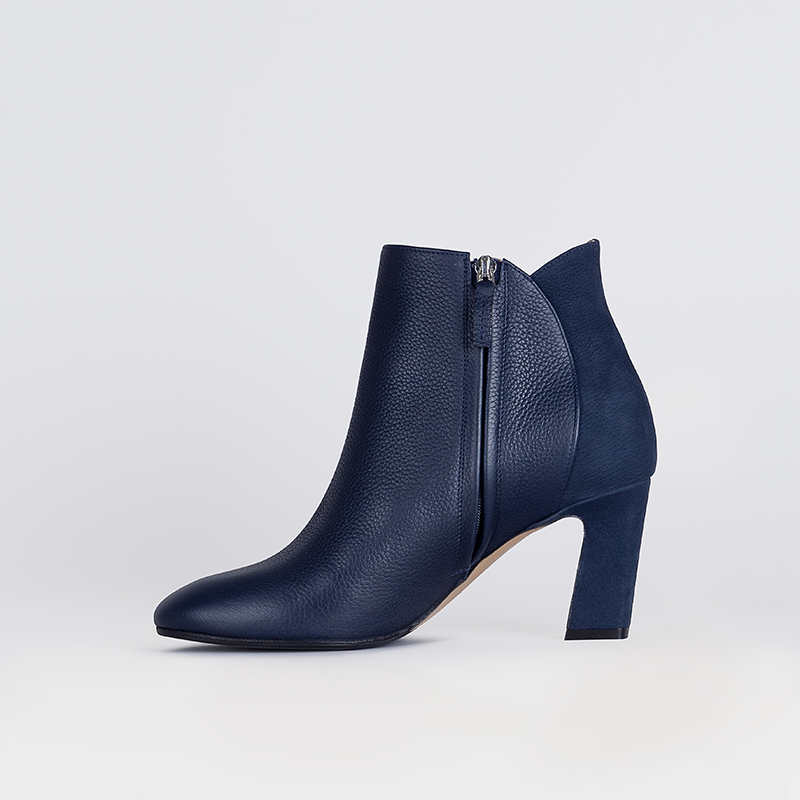 The popular Mathilde boot comes in the most beautiful combination of dark blue robust grainy leather and toned-down nubuck. Both materials are traceable leather from Danish SPOOR. Mathilde's sculptural 6.5 cm. curved block heel makes you stand strong, and she has a nice wide fit at the top. The fit is made on the same last as the discontinued Tanja boot.