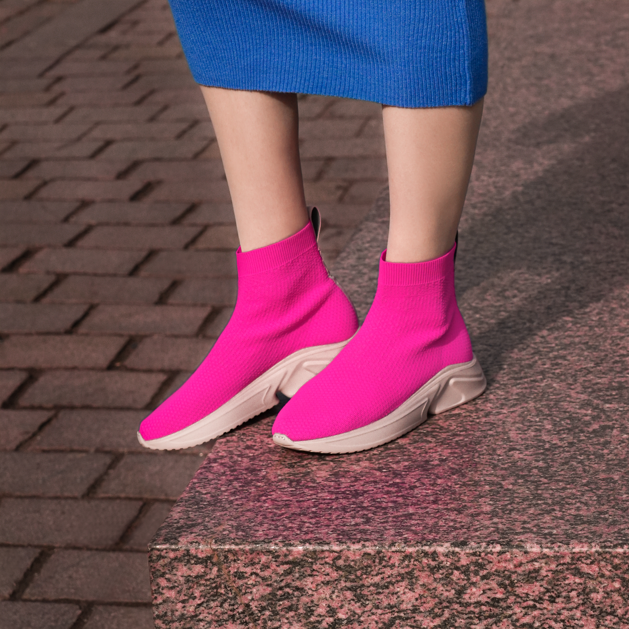 Get ready for the ultra-comfortable and stylish Racva Sneaker Boot Neon Pink with cool pink contrast color inside. There will only be 120 pairs. The knitted mesh material adapts to your foot and is woven for a supportive effect. The discreet heel strap with embroidered roccamore logo makes it easy to slip the boot on and off. You get an incredibly durable, lightweight sneaker boot with a pink shock-absorbing rubber sole and leather insole for an unmatched comfort experience. Created by our innovative production team in Portugal, these handcrafted sneaker boots combine style, comfort and functionality in the most distinguished way.