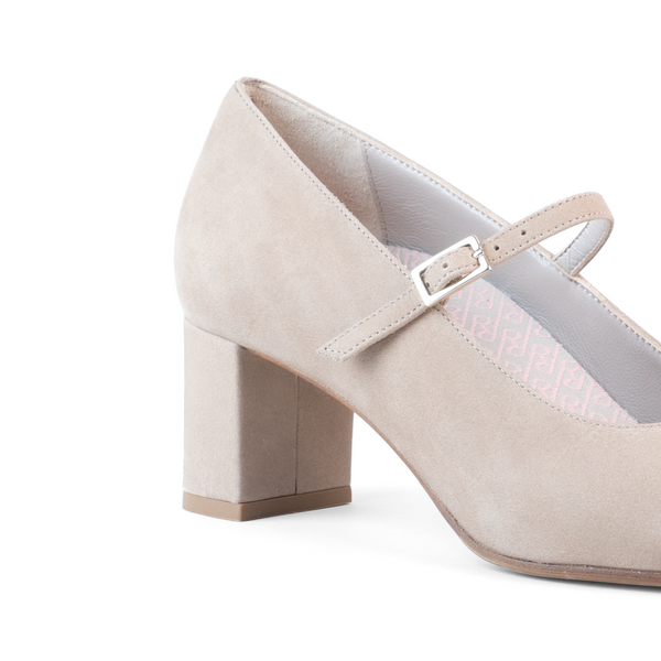 A practical yet elegant block heel pump, made from soft nubuck with a leather buckle and an adjustable strap. Based on our bestsellers Leonora and Malou, she is filled with classic elegance. Her 5 cm heel is ideal for a day a the office or going on adventures. She has a wider foot, with plenty of space for your toes. Her scientifically validated orthopaedic insole that helps to relieve pressure in your feet.