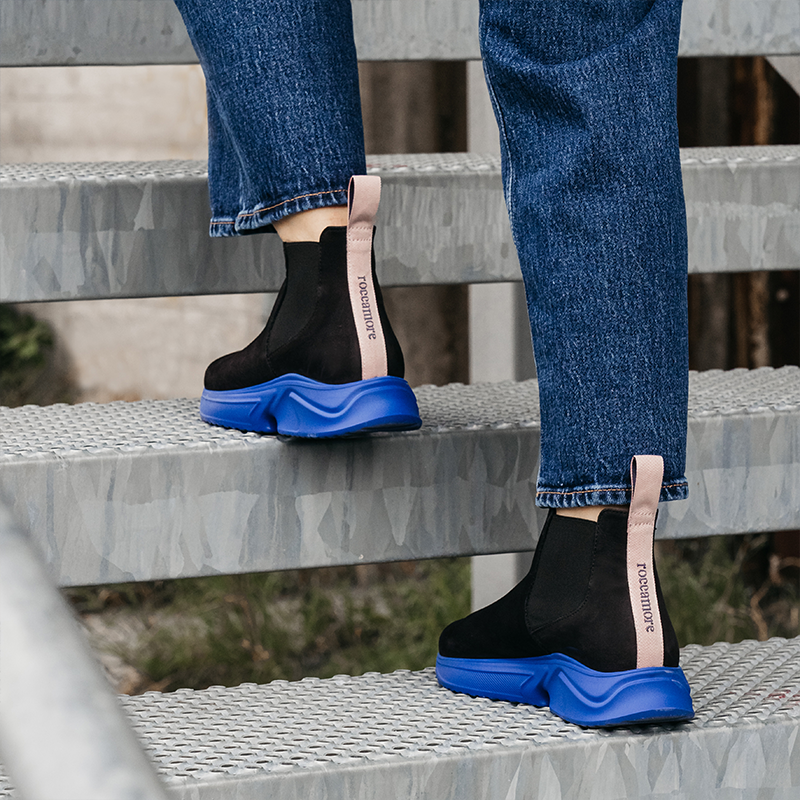 Discover an eye-catching color combination with an iris blue sole and black nubuck leather. Nubuck is an extra robust surface that withstands the Danish weather. Although it is not waterproof, it easily repels moisture. The nubuck leather adapts to your foot perfectly and is especially good for wide feet and smaller bunions. The elastic detail in the shaft follows your gait naturally. The discreet heel strap with embroidered roccamore logo makes it easy to slip the boot on and off. Get ready to experience an incredibly durable, lightweight sneaker boot that's more comfortable than you ever dreamed of! The shock-absorbing sole and comfortable insole provide an unrivaled experience of comfort. Created by our innovative production team in Portugal, the handmade leather sneakerboot combines style, comfort and functionality in the most distinguished way.